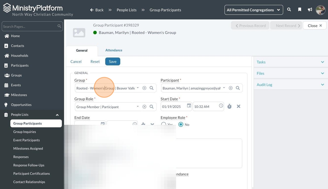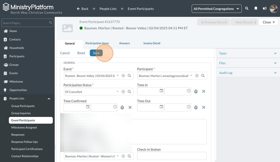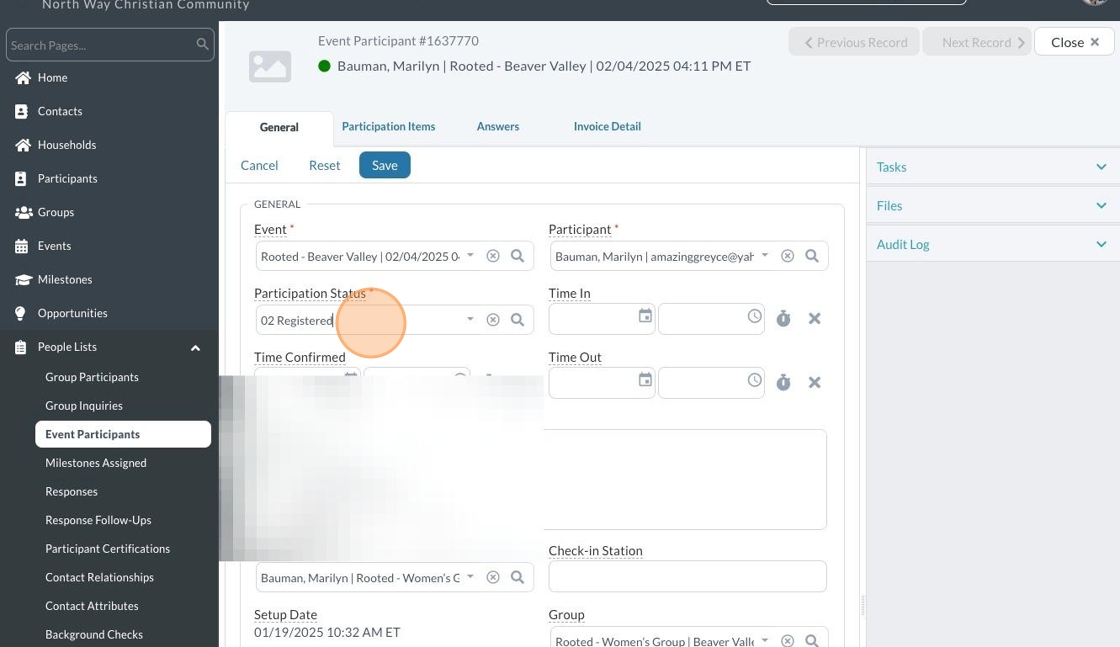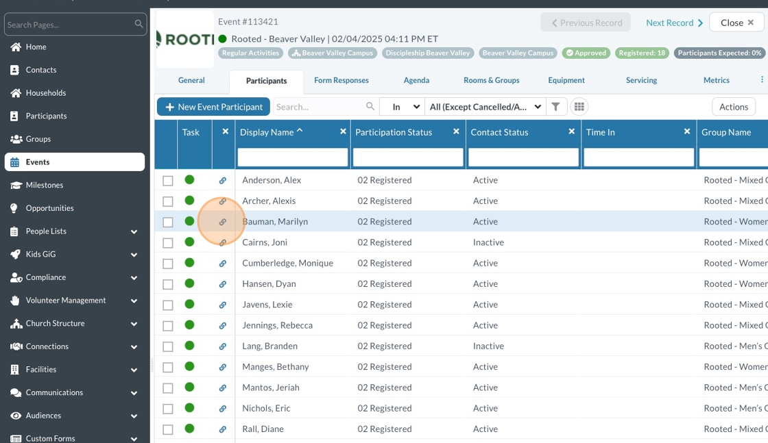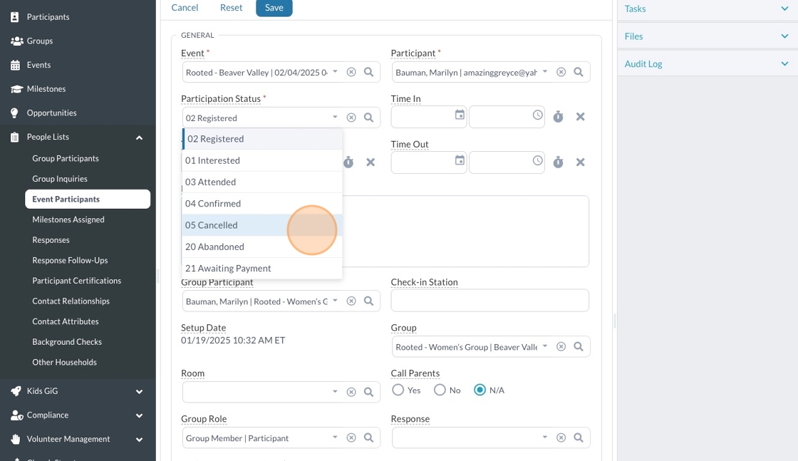- Changing an Event Participant to "Cancelled" will automatically open the spot on the registration for their group selection, and will end-date their Group Participant record (this process takes place overnight).